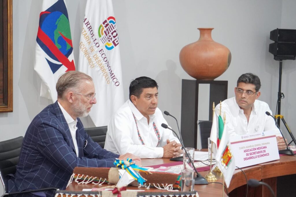 Oaxaca de Juárez, Oax., 25 de agosto de 2023.- Al dar la bienvenida a integrantes de la Asociación Mexicana de Secretarios de Desarrollo Económico A.C. (AMSDE), que en la capital del estado realiza su Cuarta Asamblea General Ordinaria, el Gobernador Salomón Jara Cruz destacó que en su administración se impulsa un modelo integral de crecimiento que permita llevar riqueza y bienestar a la población oaxaqueña.