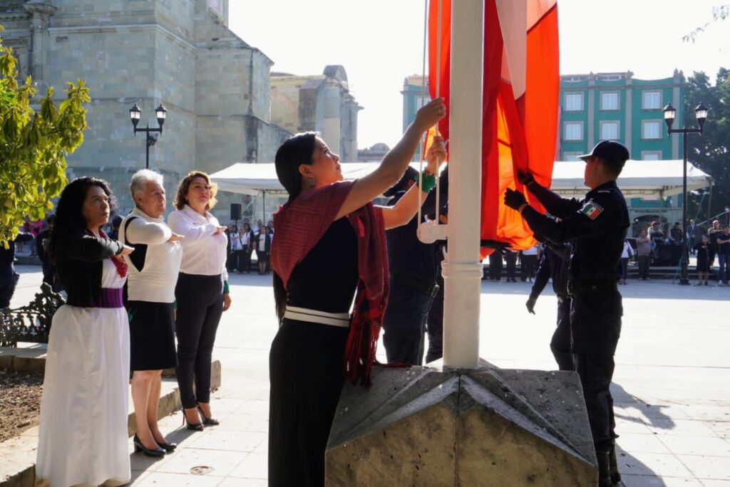 Oaxaca de Juárez, Oax. 28 de septiembre de 2023.- Como parte de las actividades de Septiembre, mes de la Patria, mes de la Primera Transformación, la Secretaría de las Mujeres encabezó la Ceremonia de Izamiento de la Bandera Nacional en la Alameda de León de la ciudad de Oaxaca, para recordar y reconocer el legado de las mujeres que fueron parte del movimiento de la Independencia de México.