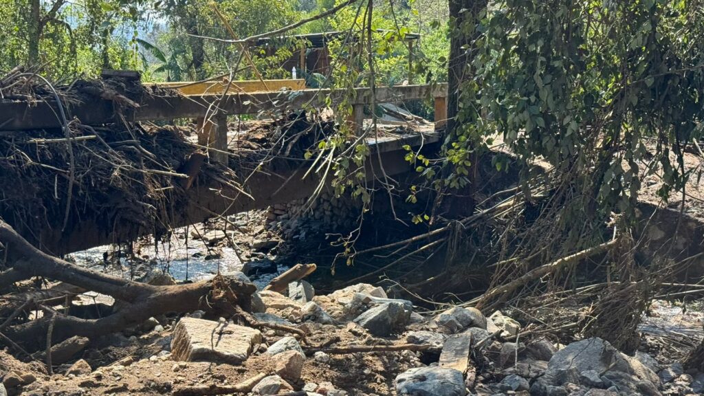 Un puente destruido por la creciente de un arroyo.