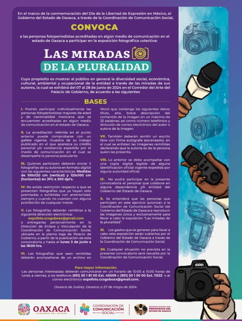 Oaxaca de Juárez, Oax. 28 de mayo de 2024.- En el marco del Día de la Libertad de Expresión que se conmemora el 7 de junio, el Gobierno del Estado de Oaxaca a través de la Coordinación de Comunicación Social, realizará la exposición fotográfica Las miradas de la pluralidad, por lo que abre la convocatoria para que personas fotoperiodistas de la entidad puedan participar.