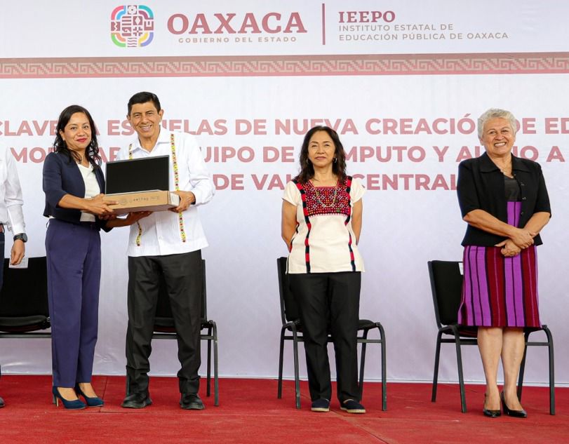 • En este marco, el Gobernador Salomón Jara Cruz entregó mobiliario, equipo de cómputo y audio a 32 escuelas de nivel básico de la región Valles Centrales
