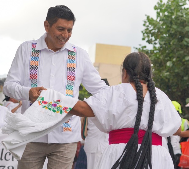 La imparable lluvia que cayó sobre la Verde Antequera no impidió que las y los oaxaqueños, así como visitantes nacionales y extranjeros, formaran parte de este encuentro encabezado por la representante de la Diosa Centéotl 2024, Juana Hernández López, junto al Gobernador Salomón Jara Cruz y la Presidenta Honoraria del Sistema DIF Oaxaca, Irma Bolaños Quijano.