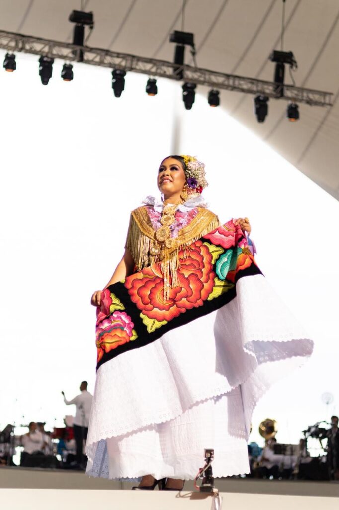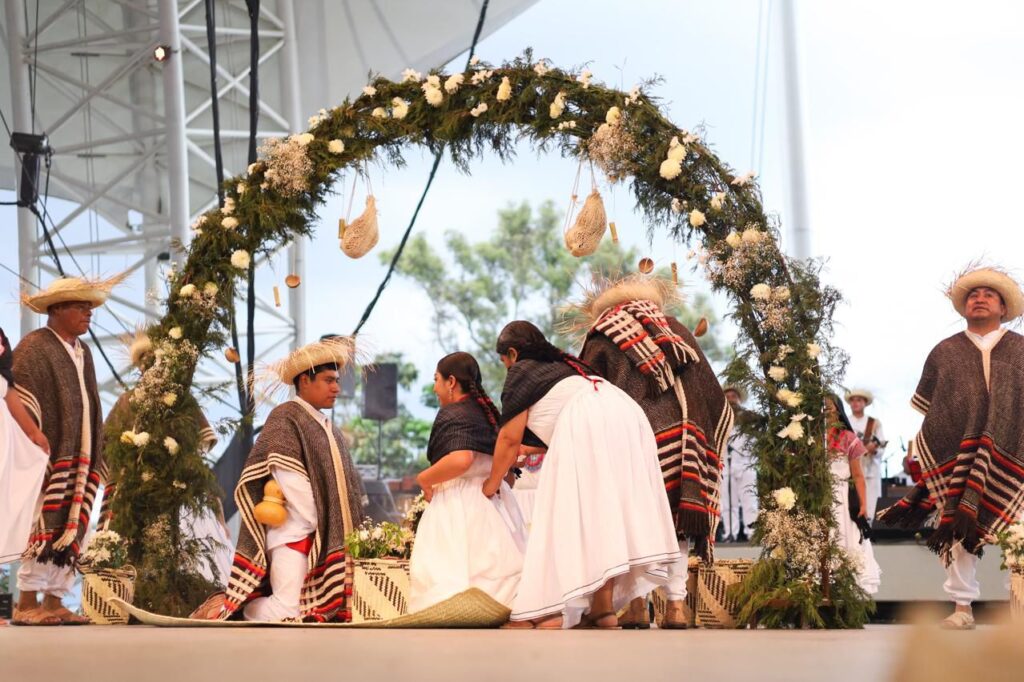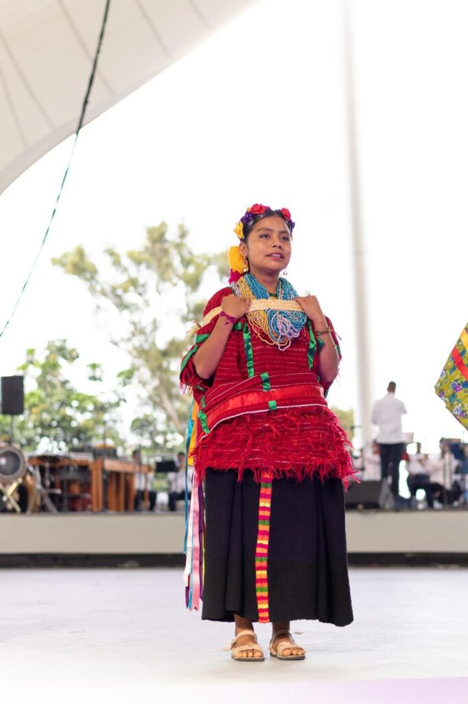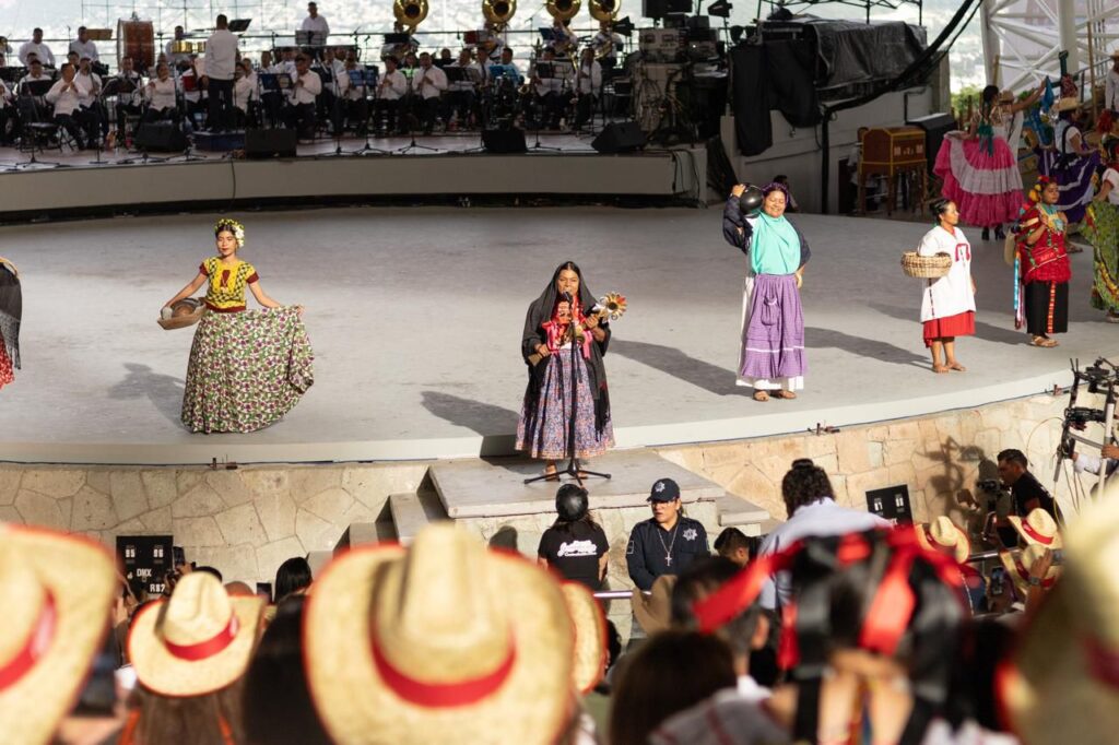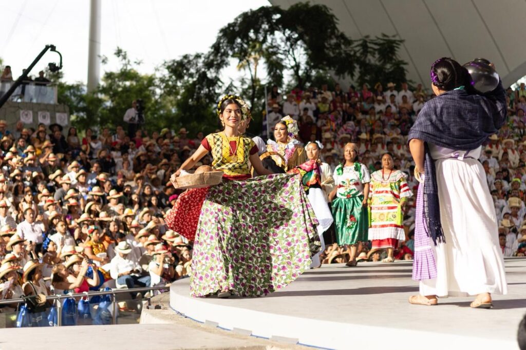 Esta última presentación inició con la entonación de pie del emblemático “Dios nunca muere” de Macedonio Alcalá, en seguida la participación de la representante de la Diosa Centéotl 2024, Juana Hernández López, acompañada de sus hermanas de las ocho regiones de la entidad, expresó la alegría que representa esta celebración llena de color.