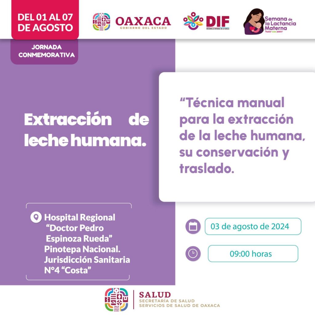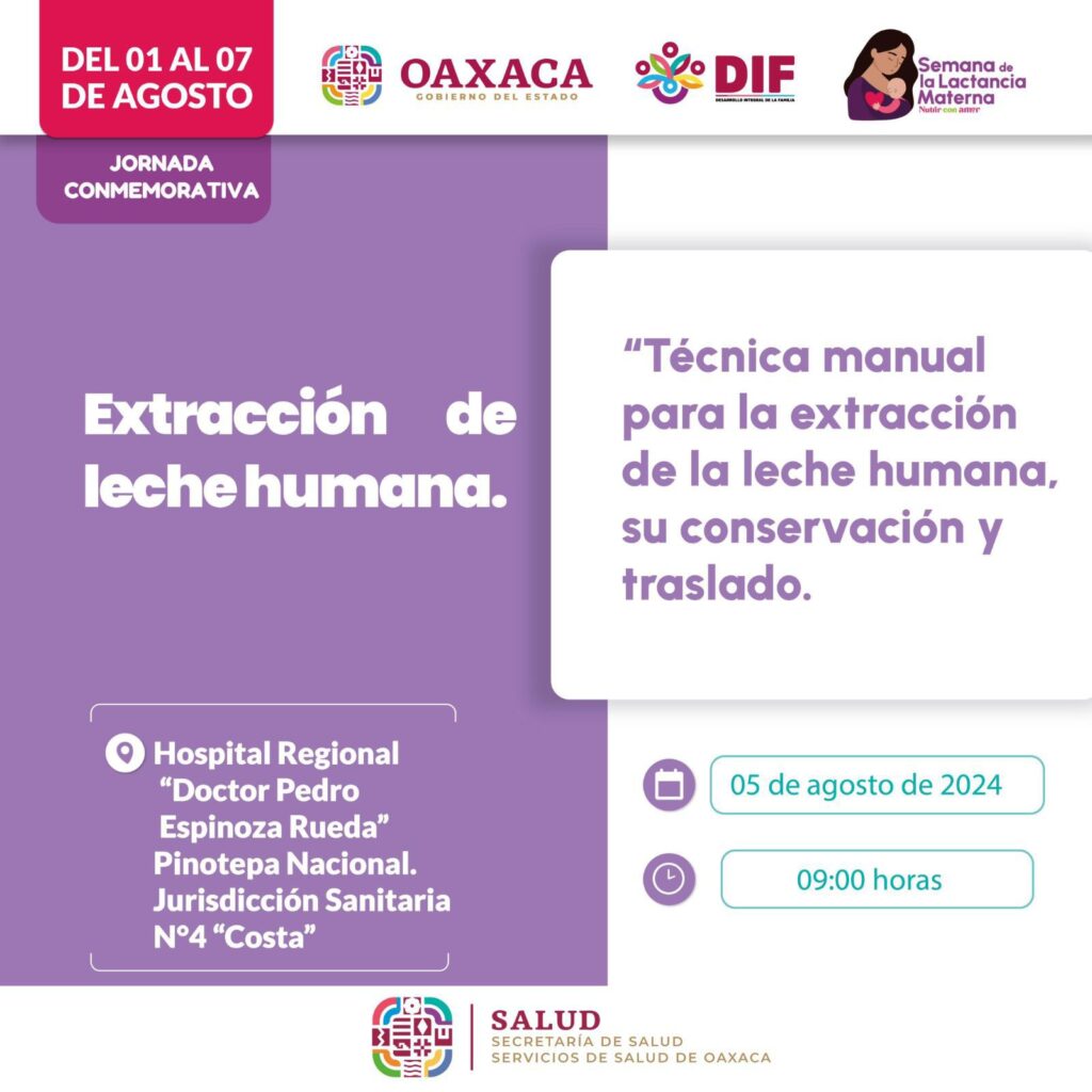 Para el 3 y 5 de agosto a las 9:00 horas el hospital Regional Doctor Pedro Espinoza Rueda en Pinotepa Nacional, será sede del curso Técnica manual para la extracción de la leche humana, su conservación y traslado.