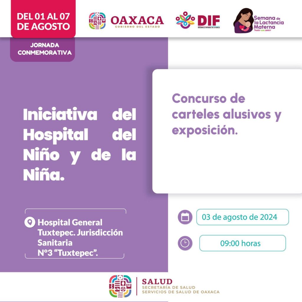 Para el 3 de agosto a las 9:00 horas se llevará a cabo un concurso de carteles alusivos y exposición en el Hospital General de Tuxtepec y a la misma hora; pero en el Centro de Salud con Servicios Ampliados (CESSA) de Tlalixtac de Cabrera, una ponencia sobre beneficios de la Lactancia Materna para el bebé y la madre, así como los Riesgos en el uso del biberón y chupón.