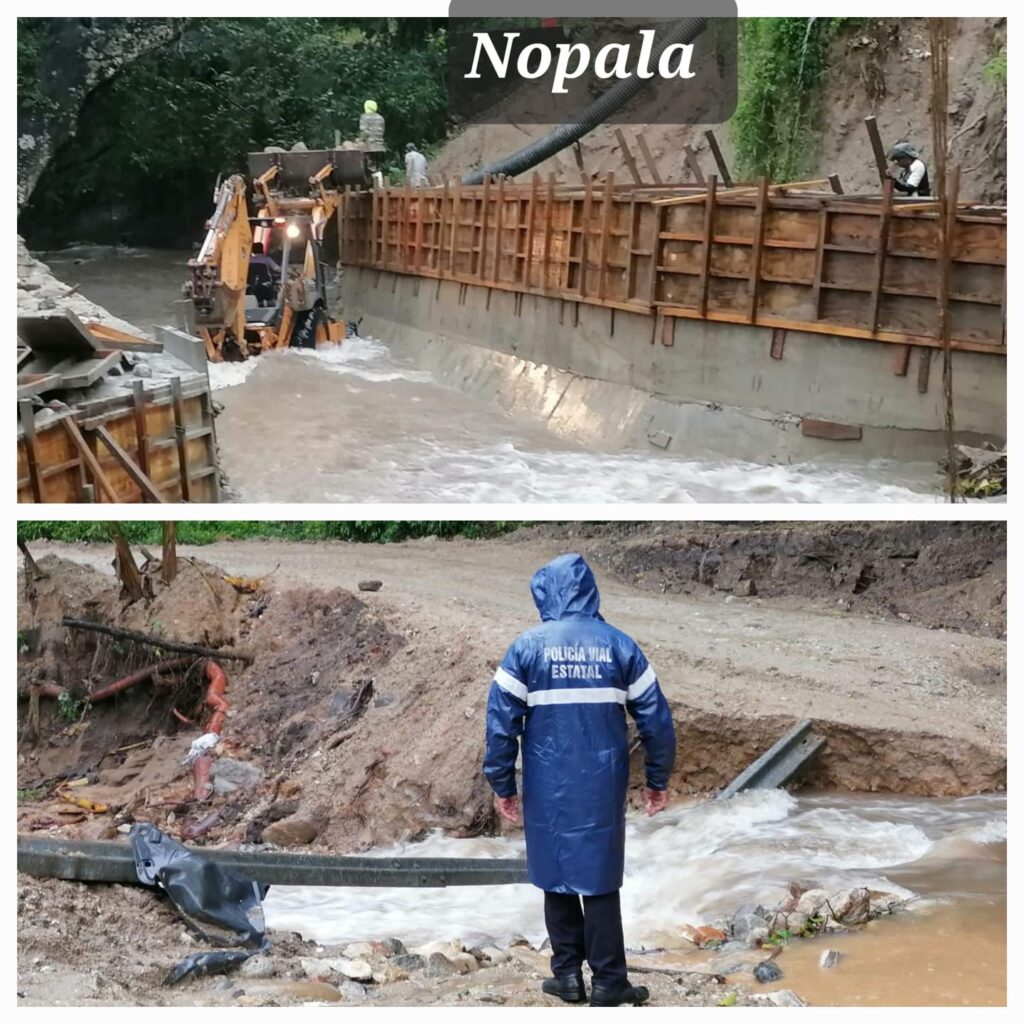 En Santos Reyes Nopala, la Carretera Estatal 131, kilómetro 210, a la altura del paraje El Camarón se registra un deslave por lo que solo hay paso en un solo carril, y se trabaja para retirar los obstáculos; asimismo, se informa que el Río San Gabriel se encuentra en un 80 por ciento de su capacidad.