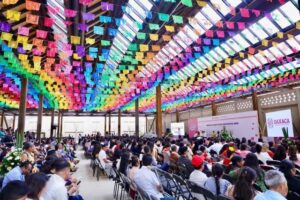Oaxaca de Juárez. Oax. 14 de febrero de 2025.- Siendo testigos de honor, el Gobernador Salomón Jara Cruz y la Presidenta Honoraria del Sistema para el Desarrollo Integral de la Familia (DIF) Oaxaca, Irma Bolaños Quijano, 300 parejas de Valles Centrales contrajeron matrimonio civil, como parte de las Bodas Colectivas Gratuitas 2025 “Dale el sí con todos los derechos” que promueve el Gobierno de Oaxaca.
