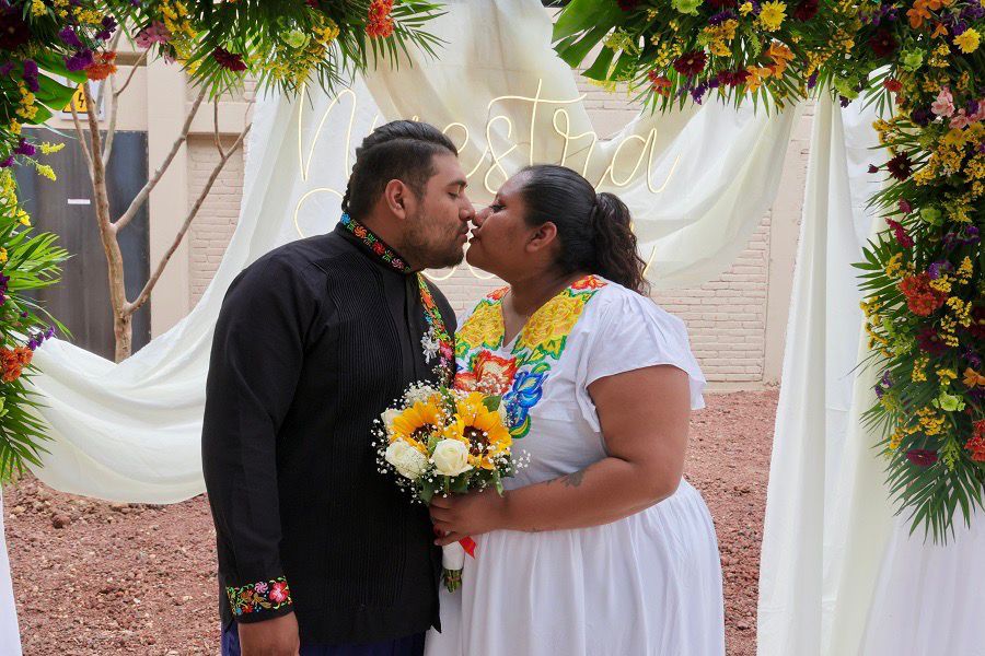 Tal es el caso de Irma García Hernández y César Ambrosio Luis, originarios de Santa María Coyotepec, quienes tienen dos hijos, y este viernes 14 de febrero, contrajeron nupcias ante el Oficial del Registro Civil del Estado, Antonio Brachetti Silva, en presencia del Mandatario estatal y la Presidenta Honoraria del Sistema DIF Oaxaca.
