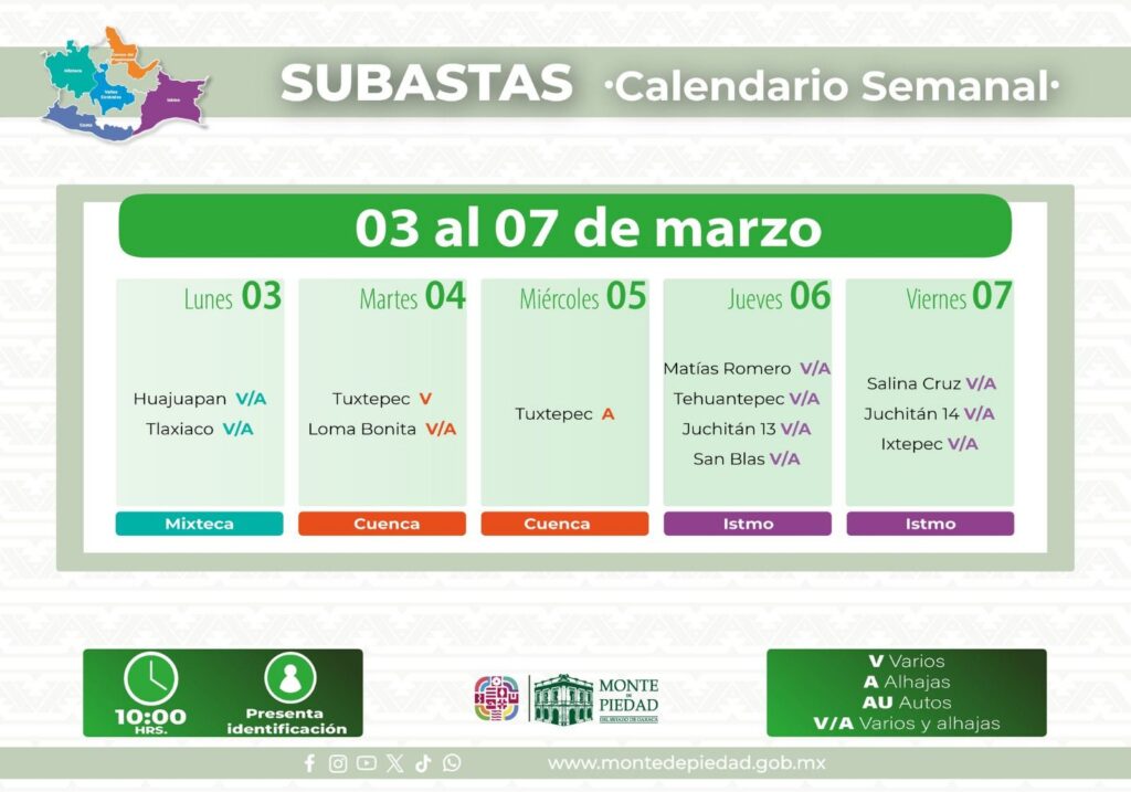 Oaxaca de Juárez, Oax. 1 de marzo de 2025.- El Monte de Piedad del Estado de Oaxaca realizará más de 60 subastas públicas en sus 24 sucursales, ubicadas en las regiones del Istmo de Tehuantepec, Cuenca del Papaloapan, Mixteca, Valles Centrales y Costa, del 3 al 28 de marzo.