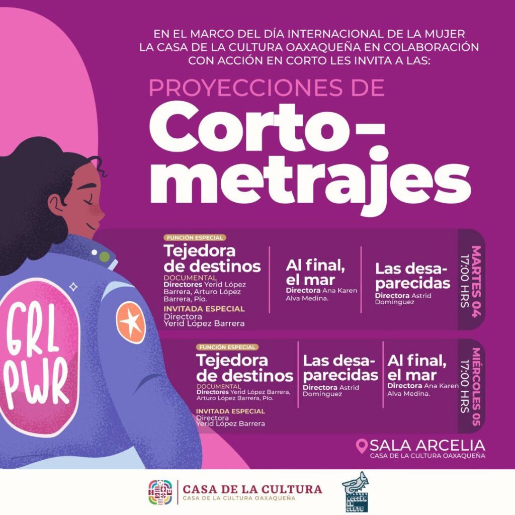 Para visibilizar las adversidades que enfrentan mujeres, niñas y adolescentes, en especial, aquellas que se encuentran en situación de riesgo, se proyectarán los cortometrajes: “Tejedora de destinos” de Yerid López Barrera y Arturo López Barrera Pío; “Al final, el mar” de Ana Karen Alva Medina; y “Las desaparecidas” de Astrid Domínguez; en la sala “Arcelia Yañiz” de la CCO, el martes 4 y miércoles 5 a las 17:00 horas.