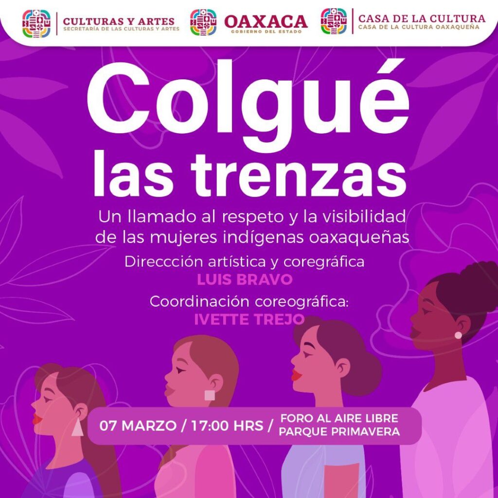 Asimismo, en el foro al aire libre del Parque Primavera Oaxaqueña Cho Ndobá, este 7 de marzo, a las 17:00 horas, bajo la dirección artística de Luis Bravo y la coordinación coreográfica de Ivette Trejo, se realizará la presentación del montaje coreográfico “Colgué las trenzas”.