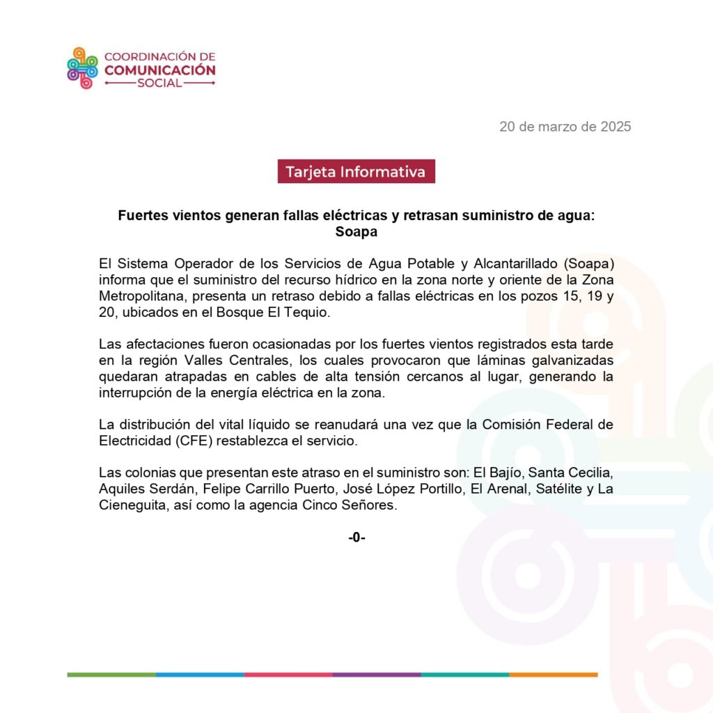Las afectaciones fueron ocasionadas por los fuertes vientos registrados esta tarde en la región Valles Centrales, los cuales provocaron que láminas galvanizadas quedaran atrapadas en cables de alta tensión cercanos al lugar, generando la interrupción de la energía eléctrica en la zona.