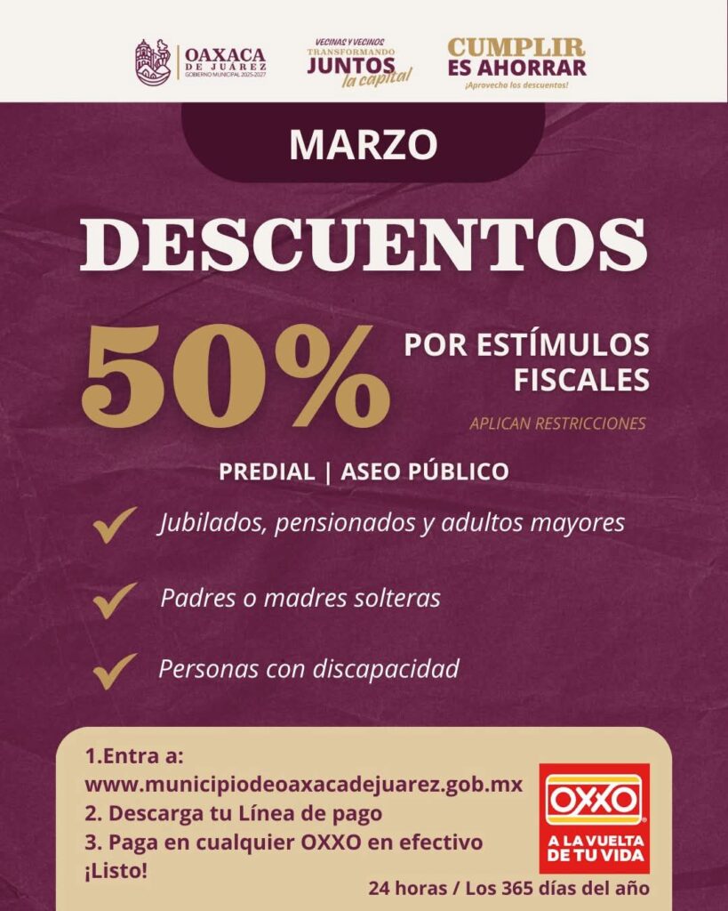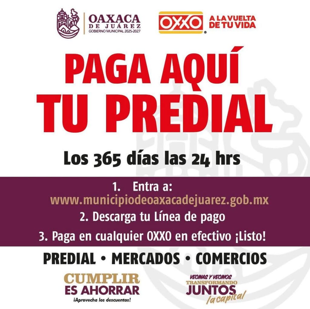 Para ello, las y los vecinos solo deben ingresar a la página oficial del municipio: www.municipiodeoaxacadejuarez.gob.mx, descargar la línea de pago y acudir a cualquier tienda OXXO, donde podrán pagar en efectivo las 24 horas del día, los 365 días del año.