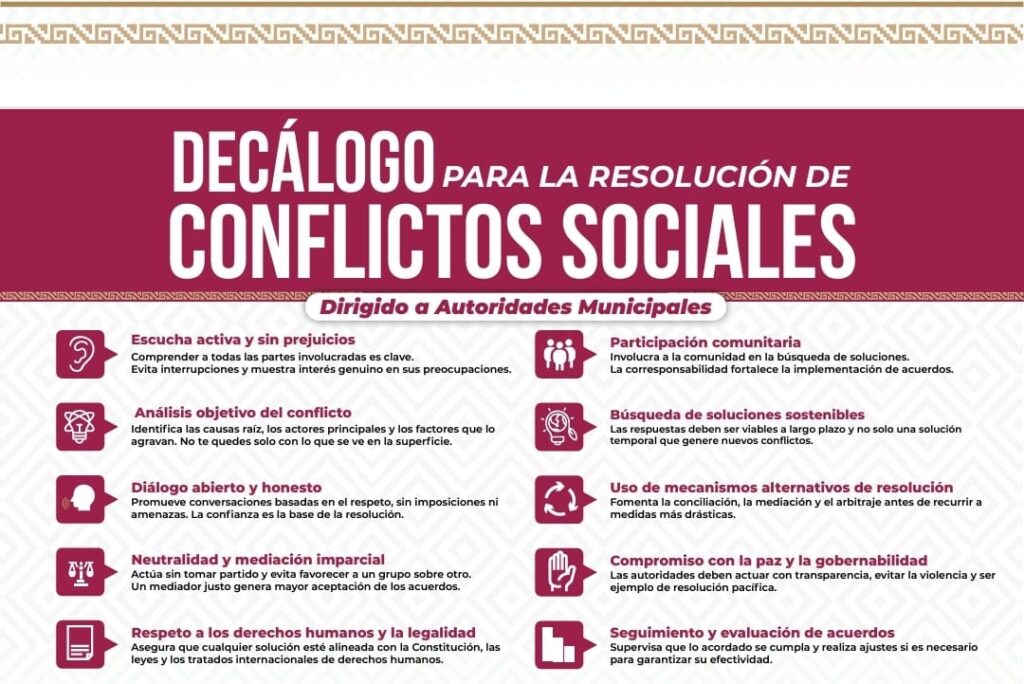 Oaxaca de Juárez, Oax. 20 de marzo de 2025.- En compromiso con la construcción y consolidación de entornos pacíficos, el Gobierno del Estado a través de la Secretaría de Gobierno (Sego), presenta un decálogo que consta de 10 puntos prioritarios, como columna vertebral, para la resolución de conflictos en las ocho regiones de la entidad.