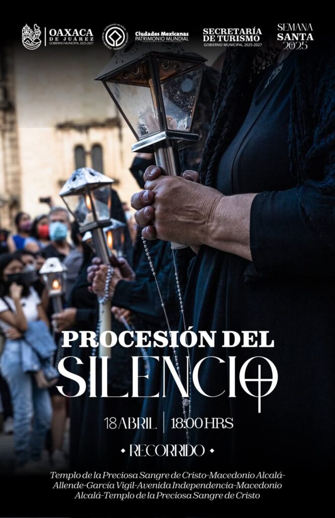 Oaxaca de Juárez, Oax., 17 de abril de 2025.- El Municipio de Oaxaca de Juárez, a través de la Secretaría de Turismo, invita a vecinas y vecinos, así como a visitantes a ser parte de la tradicional Procesión del Silencio, que se realizará este viernes 18 de abril a las 18:00 horas, partiendo desde el Templo de la Preciosa Sangre de Cristo.