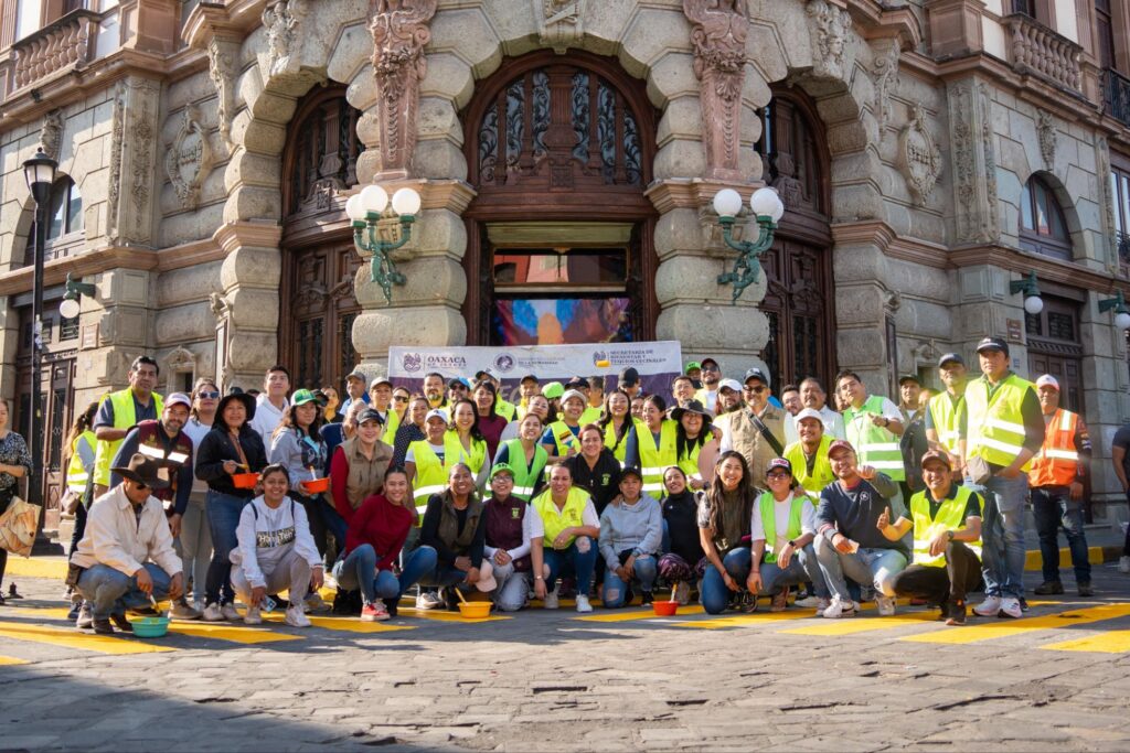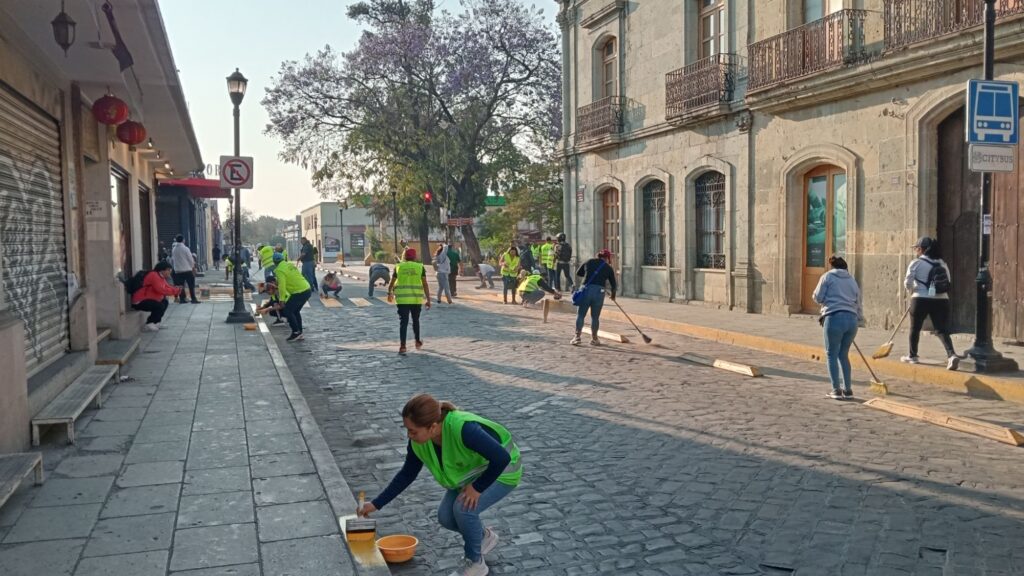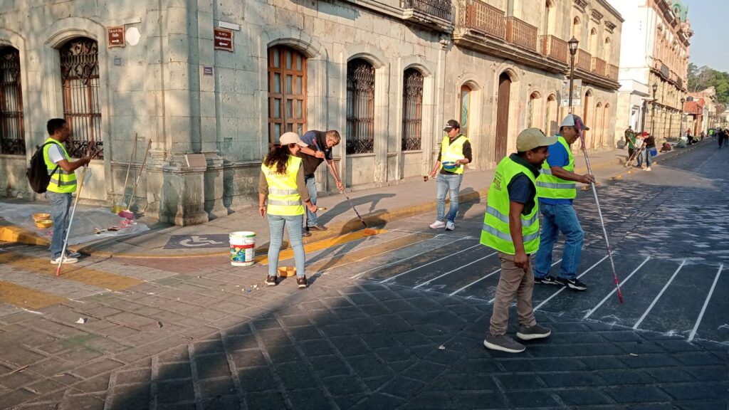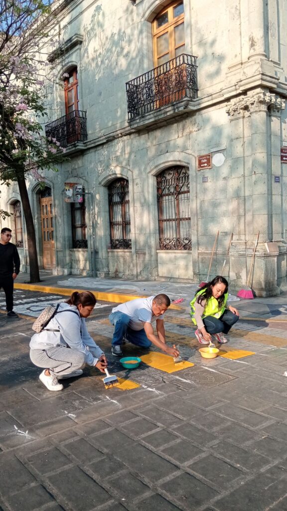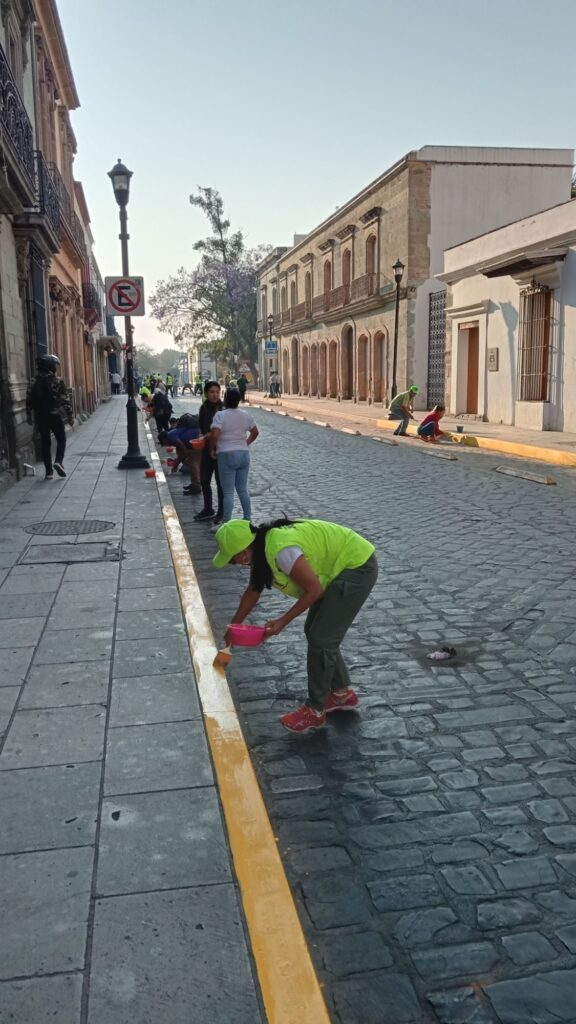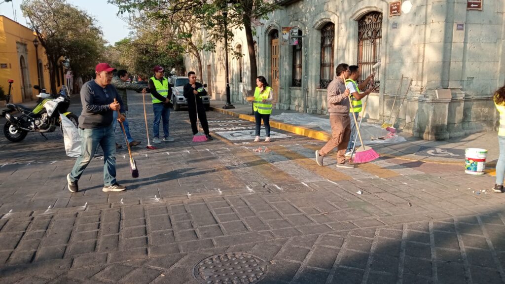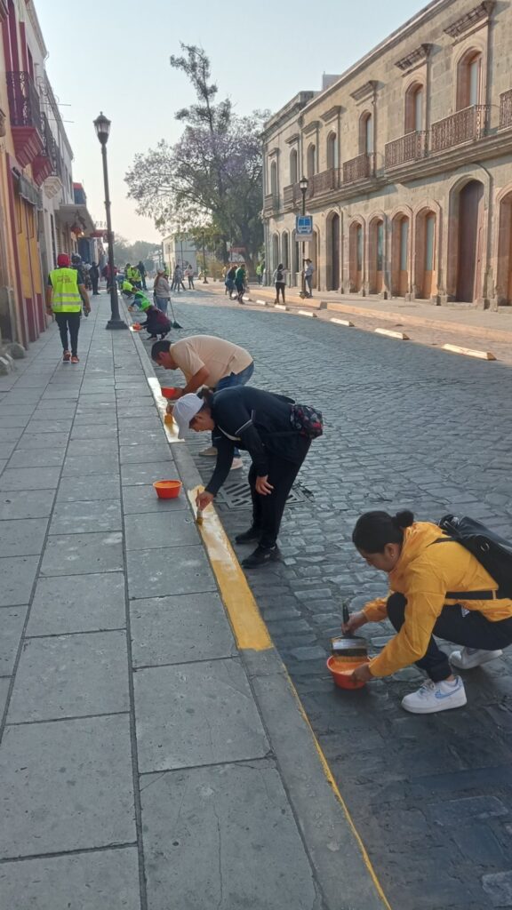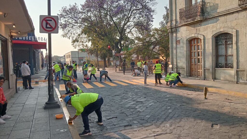Oaxaca de Juárez, Oax., 19 de abril de 2025.- En un esfuerzo conjunto por embellecer y dignificar los espacios públicos del Centro Histórico, el Municipio de Oaxaca de Juárez llevó a cabo un tequio vecinal en las calles de Avenida Independencia, al cruce con Cinco de Mayo y Reforma, donde se realizaron labores de limpieza general y pintado de cruces viales.