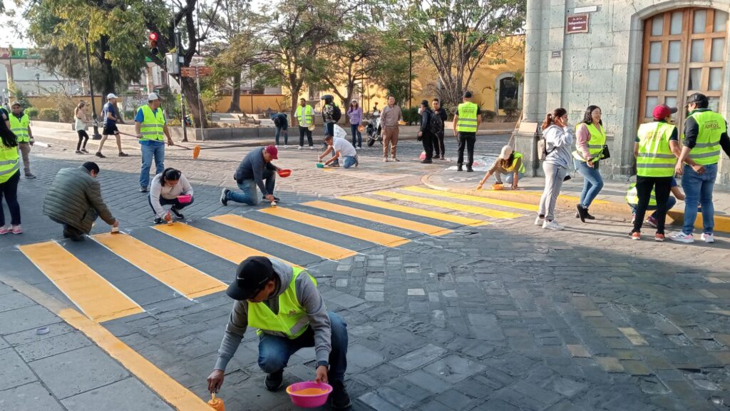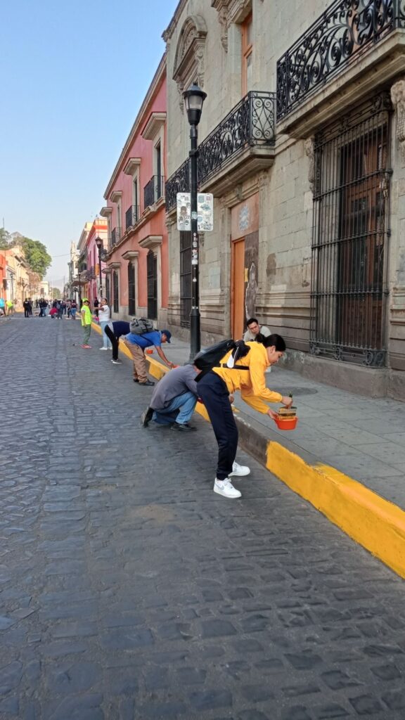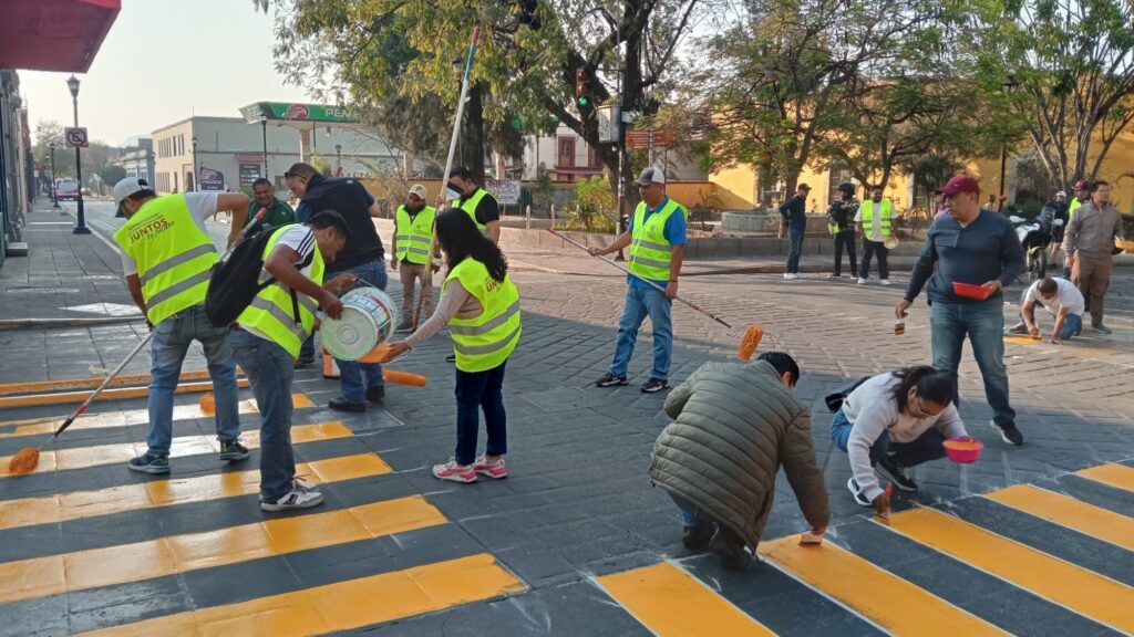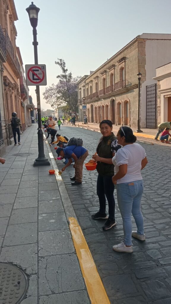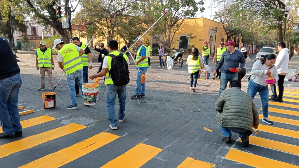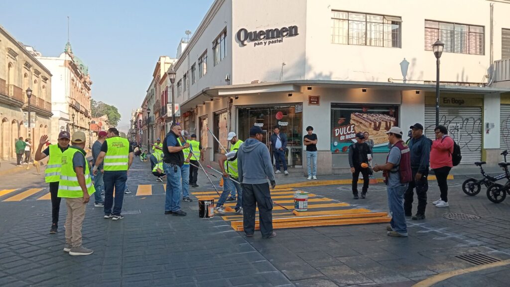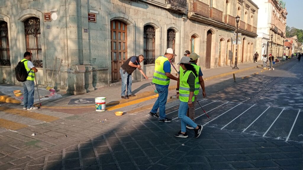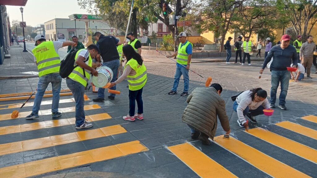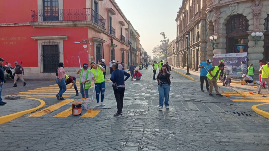 Oaxaca de Juárez, Oax., 19 de abril de 2025.- En un esfuerzo conjunto por embellecer y dignificar los espacios públicos del Centro Histórico, el Municipio de Oaxaca de Juárez llevó a cabo un tequio vecinal en las calles de Avenida Independencia, al cruce con Cinco de Mayo y Reforma, donde se realizaron labores de limpieza general y pintado de cruces viales.