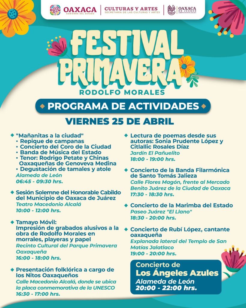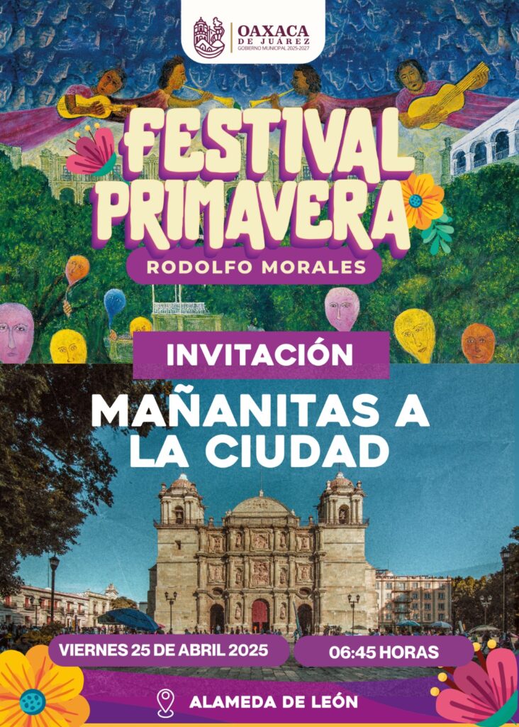 En el marco del Festival Primavera «Rodolfo Morales», las actividades comenzarán desde las 06:45 horas en la Alameda de León con las tradicionales “Mañanitas a la ciudad”, acompañadas por el repique de campanas, el Concierto del Coro de la Ciudad y la participación de la Banda de Música del Estado. También se contará con la presentación del tenor Rodrigo Petate, la alegría de las Chinas Oaxaqueñas y una degustación de tamales y atole.