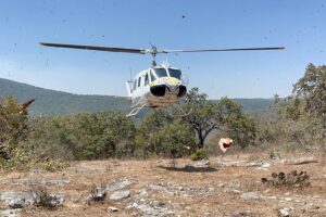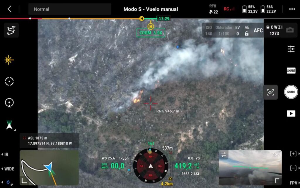 Aunado a ello, el equipo aéreo del Gobierno del Estado: Bell UH-1H, realiza el traslado de personal técnico en el manejo del fuego, pobladores, personas voluntarias y víveres para quienes se encuentran trabajando en el área.