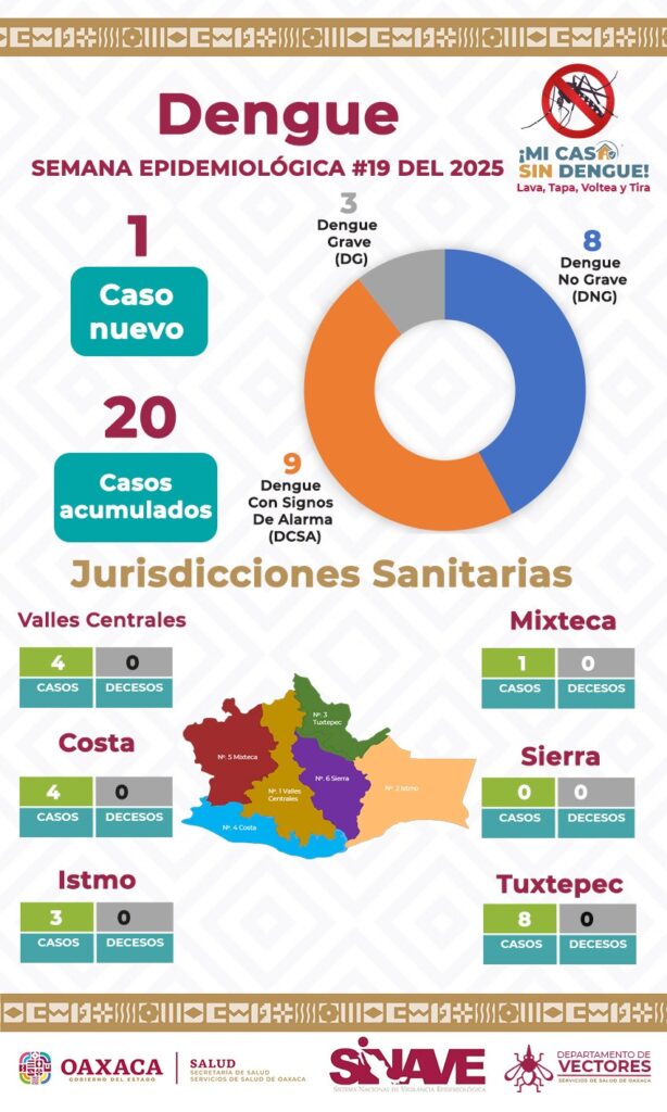 Oaxaca de Juárez, Oax. 14 de mayo de 2025.- Servicios de Salud de Oaxaca (SSO) informa que, al corte de la semana epidemiológica número 19, se registraron 20 casos acumulados de dengue en la entidad, tras la confirmación del primer caso en la Jurisdicción Sanitaria 5 Mixteca