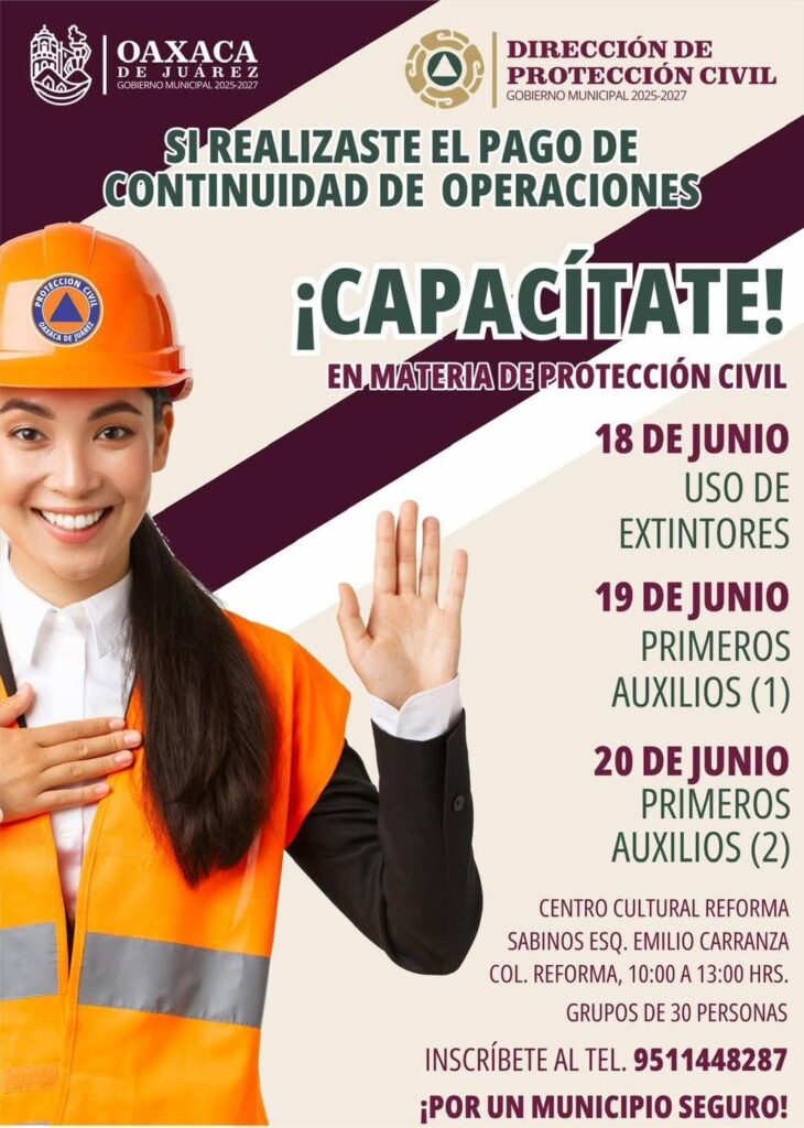 Oaxaca de Juárez, Oax., 31 de mayo de 2025.- Con el objetivo de fortalecer la seguridad desde la prevención, y por instrucción del presidente municipal Raymundo Chagoya Villanueva, la Dirección de Protección Civil de Oaxaca de Juárez llevará a cabo una nueva jornada de capacitaciones gratuitas dirigidas a propietarios y personal operativode establecimientos comerciales que hayan cumplido con el pago de continuidad de operaciones del año 2025.