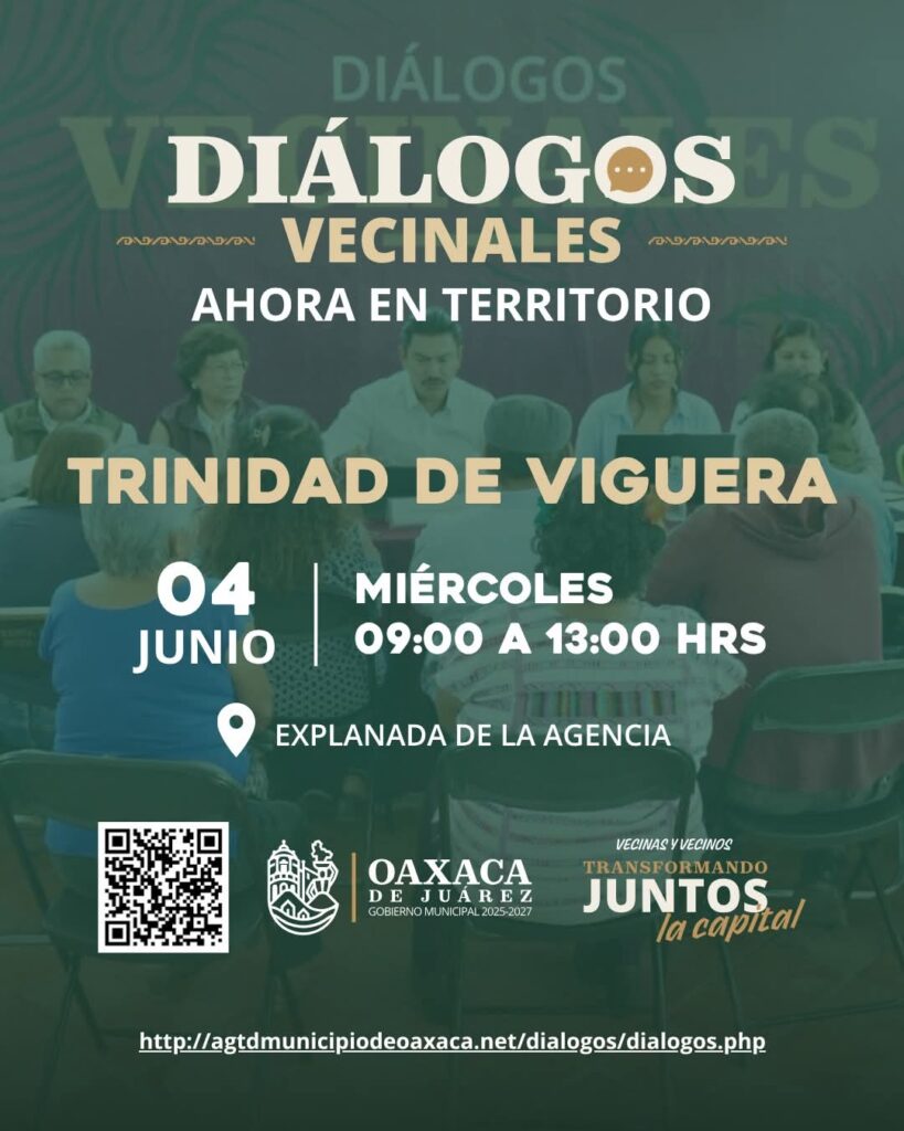 Oaxaca de Juárez, Oax. 2 de junio de 2025.- Con el compromiso de mantener un gobierno cercano, abierto y de territorio, el Ayuntamiento de Oaxaca de Juárez invita a la ciudadanía a participar en una nueva jornada de Diálogos Vecinales, este miércoles 4 de junio, en la explanada de la agencia municipal de Trinidad de Viguera, a partir de las 09:00 horas.