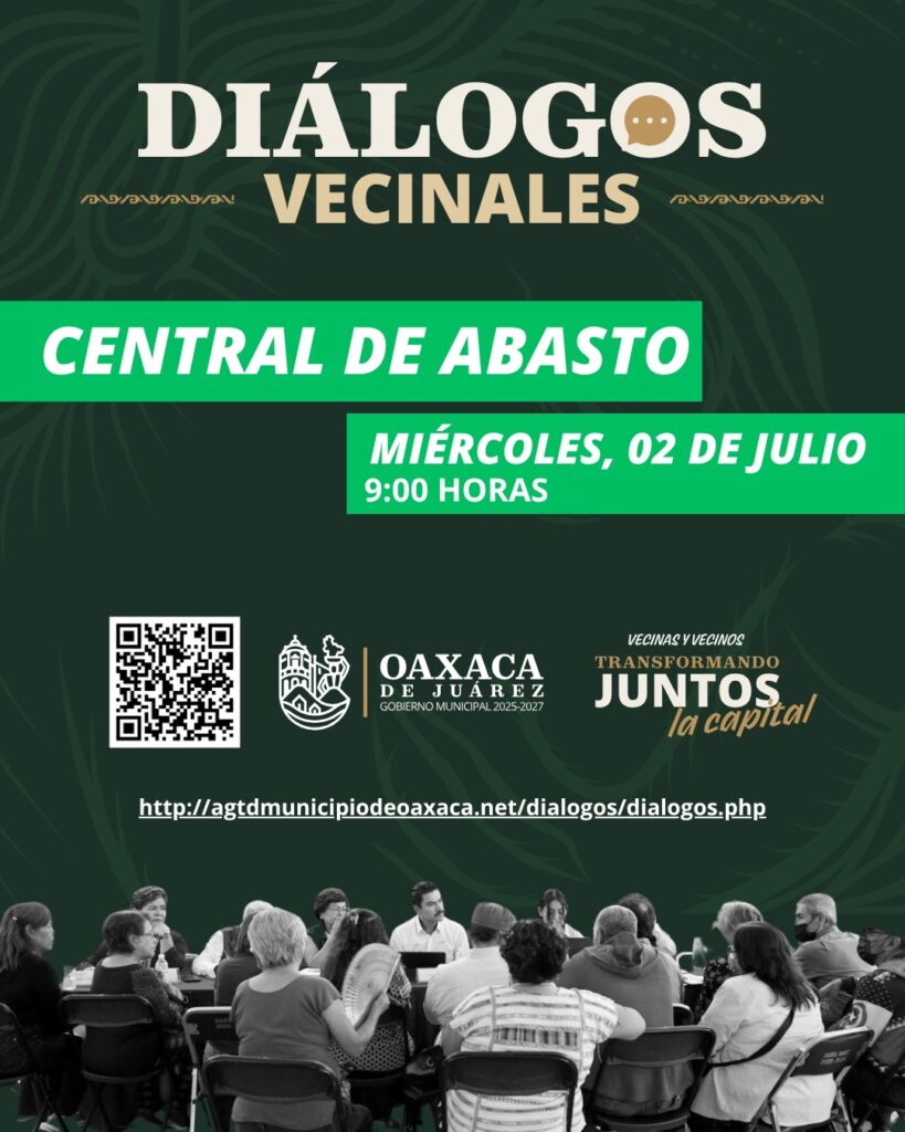Oaxaca de Juárez, Oax., 1 de julio de 2025.- El Municipio de Oaxaca de Juárez invita a las y los locatarios, así como a las y los vecinos de la capital, a participar en los Diálogos Vecinales que se llevarán a cabo este miércoles 2 de julio en la zona de bodegas de la Central de Abasto, un espacio donde por primera vez se acercan estas audiencias públicas.