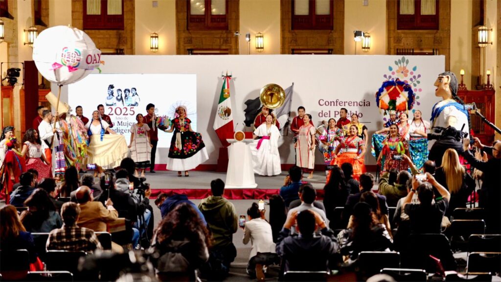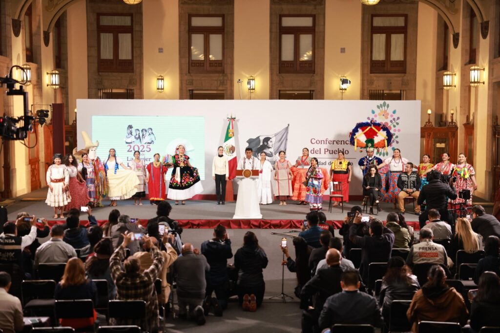 Ciudad de México, 11 de julio de 2025.- Este viernes la herencia ancestral, cultura, color, música y alegría de Oaxaca y su Guelaguetza arribaron a Palacio Nacional, durante la conferencia encabezada por la Presidenta Claudia Sheinbaum Pardo, reafirmando a la entidad como el Corazón cultural y lingüístico de México.