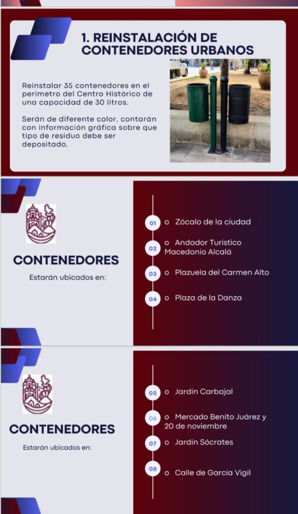 Desde el área deportiva del Fraccionamiento Los Cedros en Santa Rosa Panzacola, el secretario de Servicios Vecinales, Víctor Romero López, detalló que el operativo responde al compromiso de ofrecer una ciudad limpia, segura y ordenada para habitantes y visitantes. Entre las medidas destacan la reinstalación de 35 contenedores urbanos con capacidad de 30 litros, atendiendo una petición constante en el Centro Histórico, así como 6 papeleras dobles en el Zócalo y contenedores de 1,100 litros en puntos estratégicos.