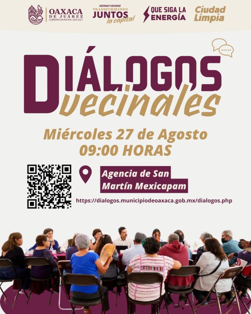 Oaxaca de Juárez, Oax. 25 de agosto de 2025.– Este miércoles 27 de agosto, a partir de las 09:00 horas, la Agencia de San Martín Mexicapam será sede de una nueva jornada de Diálogos Vecinales, donde las y los vecinos podrán expresar sus necesidades y propuestas directamente al Gobierno Municipal.
