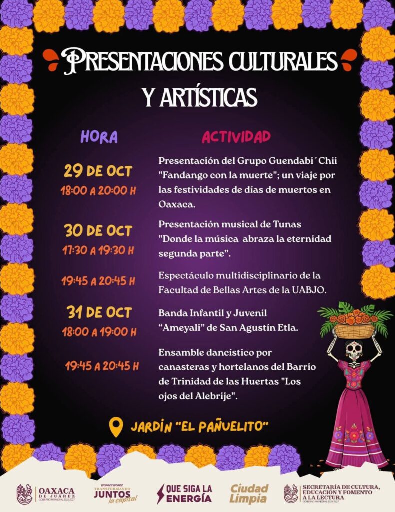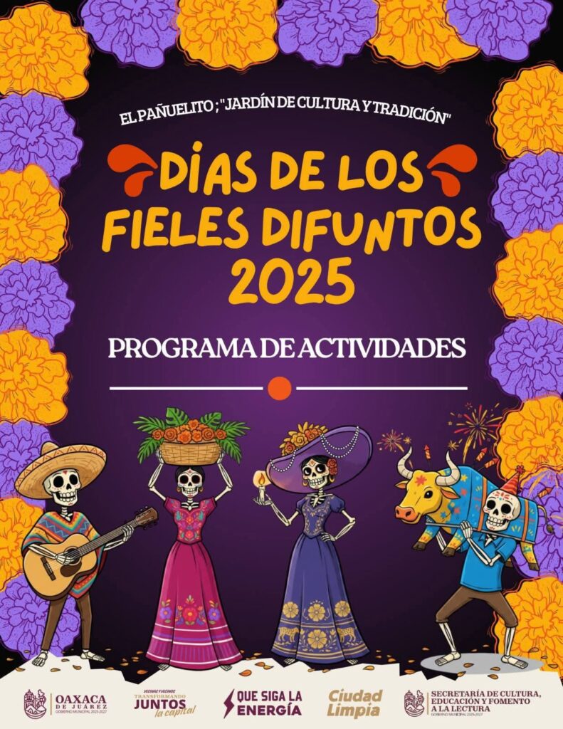 Oaxaca de Juárez, Oax. 9 de octubre de 2025.- El Municipio de Oaxaca de Juárez, a través de la Secretaría de Cultura, Educación y Fomento a la Lectura, invita a disfrutar del programa “Días de los Fieles Difuntos 2025”, una cartelera que llenará de color, música y tradición el Jardín “El Pañuelito”, del 28 de octubre al 2 de noviembre.