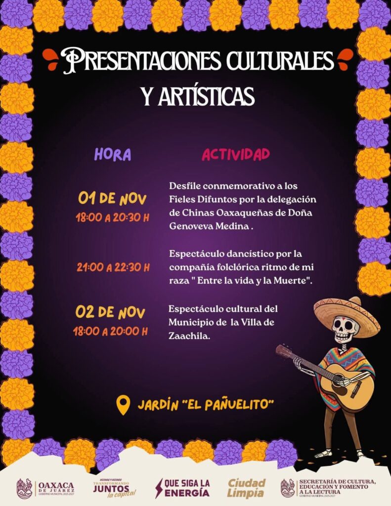 Además, las tardes se vestirán de arte con presentaciones culturales y artísticas que incluirán espectáculos de música, danza y teatro. Entre ellos, destacan la participación del Grupo Guendabí Chii con “Fandango con la Muerte”, la Banda Infantil y Juvenil “Ameyali” de San Agustín Etla, así como el ensamble dancístico “Los ojos del Alebrije” del Barrio de Trinidad de las Huertas.