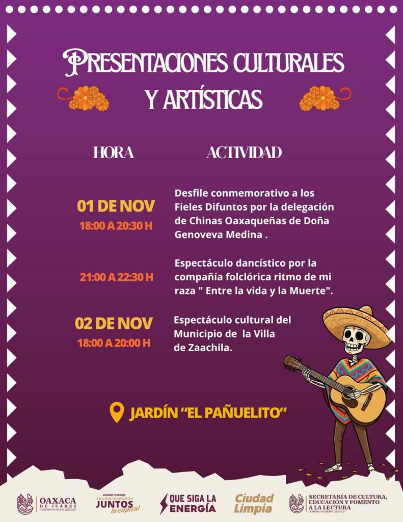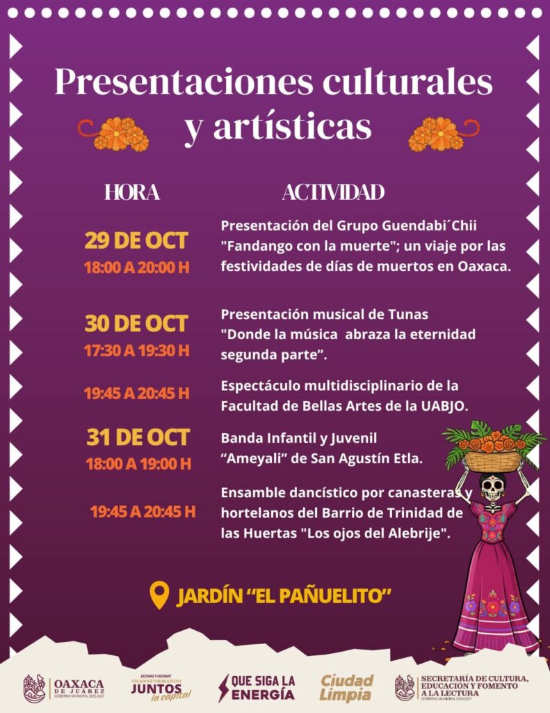 Bajo el lema “Oaxaca Ciudad: limpia, ordenada y segura, eternamente viva”, la Secretaría de Turismo Municipal dio a conocer una programación cultural que se desarrollará del 28 de octubre al 8 de noviembre, con actividades que llenarán de color, música y misticismo las calles, plazas y panteones de la ciudad.