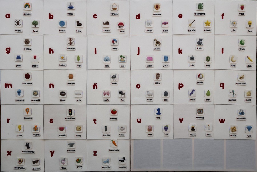 Esta pieza, que se elaboró con fieltro industrial y lana de oveja teñida con anilinas, consiste en fichas individuales con imágenes de objetos de la vida cotidiana en sobrerelieve, cuyos nombres abarcan las letras de la A a la Z.