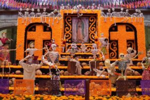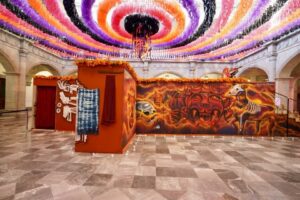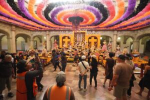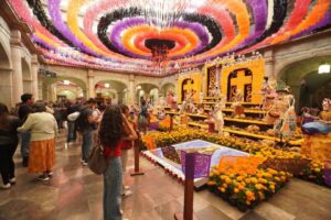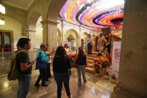 Oaxaca de Juárez, Oax. 6 de noviembre de 2025.- El Palacio de Gobierno fue el escenario en el cual las flores de cempasúchil, calaveras, velas, papel picado, fruta de temporada e imágenes religiosas; enmarcaron el Altar Monumental, apreciado por cerca de 15 mil oaxaqueñas y oaxaqueños, así como turistas nacionales e internacionales.