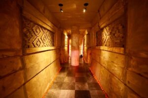 Esta réplica representó un espacio ritual en el cual se realizaban ceremonias funerarias para personajes importantes de la época prehispánica de la cultura zapoteca, se destacaron elementos característicos como las grecas y los diseños geométricos.