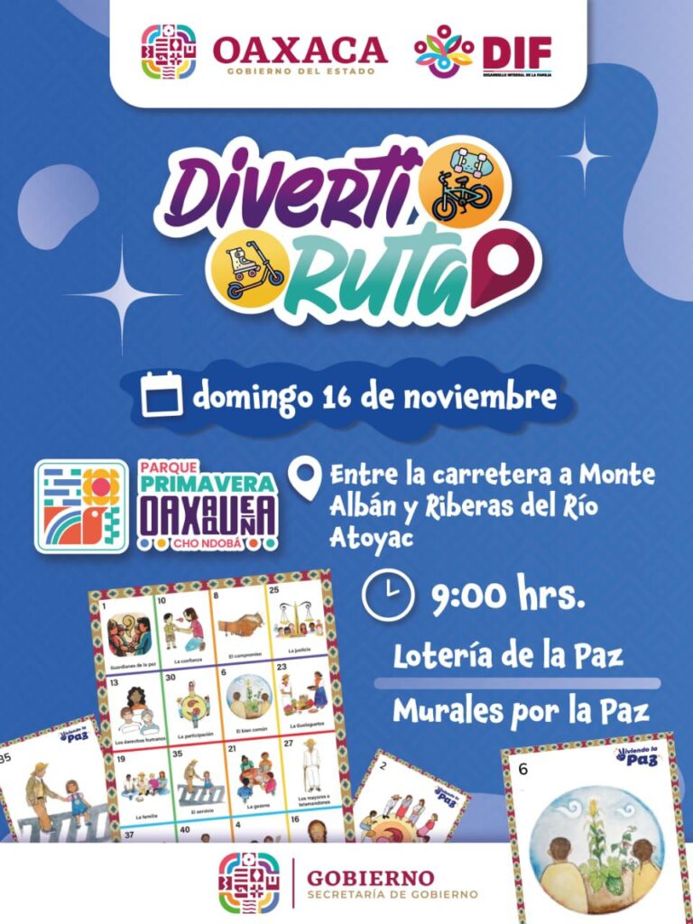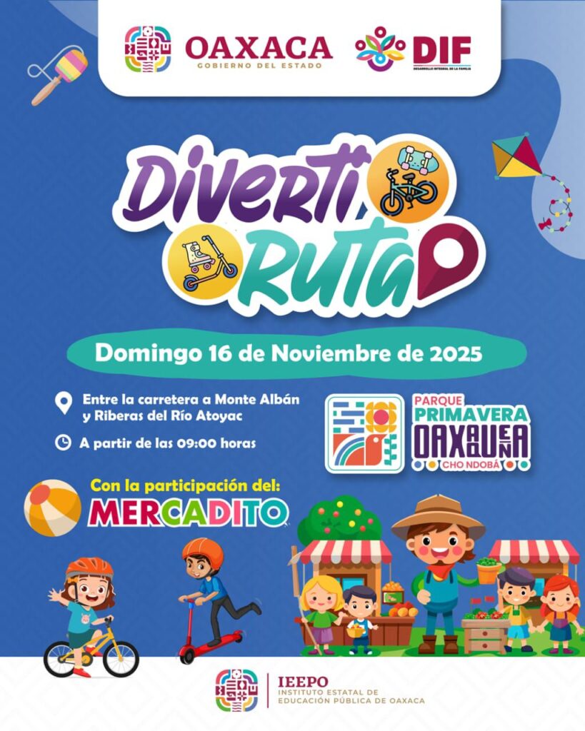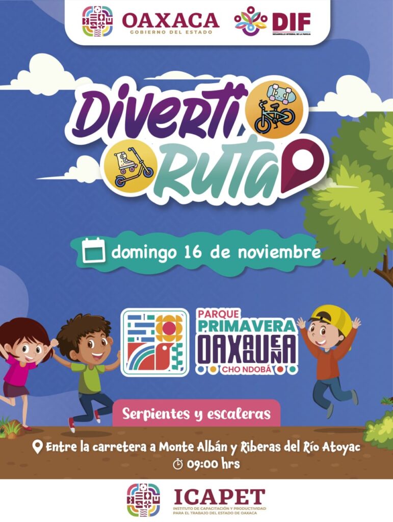 Oaxaca de Juárez, Oax. 13 de noviembre de 2025.- Este domingo 16 de noviembre, el Parque Primavera Oaxaqueña Cho Ndobá será el escenario de la edición 45 de la Diverti Ruta, iniciativa del Sistema para el Desarrollo Integral de la Familia (DIF) Oaxaca para fomentar en las infancias y adolescencias, actividades lúdicas, recreativas y deportivas.