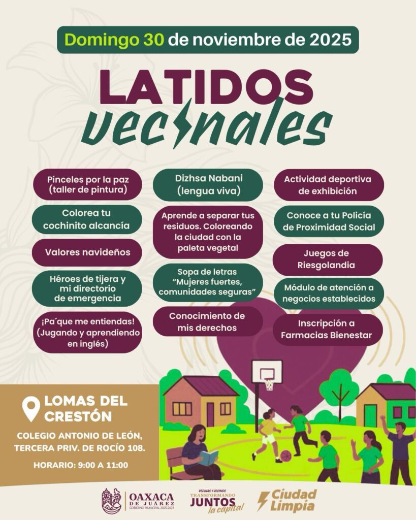 Oaxaca de Juárez, Oax., 27 de noviembre de 2025.– El Municipio de Oaxaca de Juárez que preside Ray Chagoya invita a las vecinas y vecinos de la ciudad a participar en una nueva edición de Latidos Vecinales, un encuentro comunitario que se llevará a cabo del 27 al 30 de noviembre en distintas colonias y agencias del municipio.