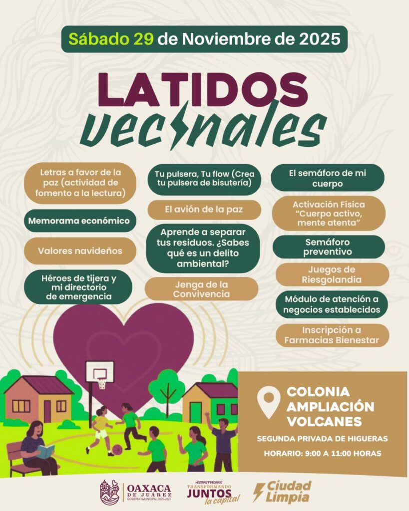 El sábado 29, Latidos Vecinales llegará a la Colonia Ampliación Volcanes con propuestas dirigidas a niñas, niños, jóvenes y personas adultas, abarcando juegos educativos, actividades artísticas, dinámicas físicas, módulos informativos y espacios de reflexión comunitaria. Para cerrar la jornada, el domingo 30 de noviembre Lomas del Crestón será sede de actividades deportivas, talleres de valores, dinámicas de conocimiento de derechos y módulos de atención ciudadana.