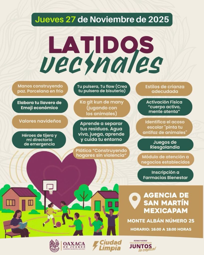 Oaxaca de Juárez, Oax., 27 de noviembre de 2025.– El Municipio de Oaxaca de Juárez que preside Ray Chagoya invita a las vecinas y vecinos de la ciudad a participar en una nueva edición de Latidos Vecinales, un encuentro comunitario que se llevará a cabo del 27 al 30 de noviembre en distintas colonias y agencias del municipio.