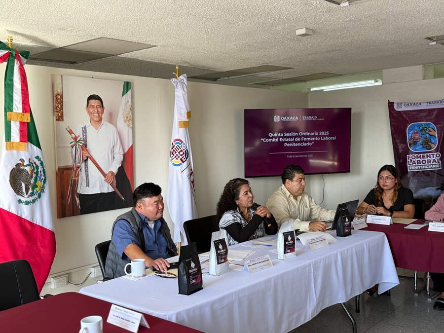 Oaxaca de Juárez, Oax. 11 de diciembre de 2025.- En la quinta sesión ordinaria del Comité Estatal de Fomento Laboral Penitenciario (CEFLP), la Secretaría del Trabajo (Setrao) resaltó que Oaxaca es la primera entidad del país en poner en marcha un Modelo Laboral Penitenciario (MLP), orientado a fortalecer la reinserción de las Personas Privadas de su Libertad (PPL).