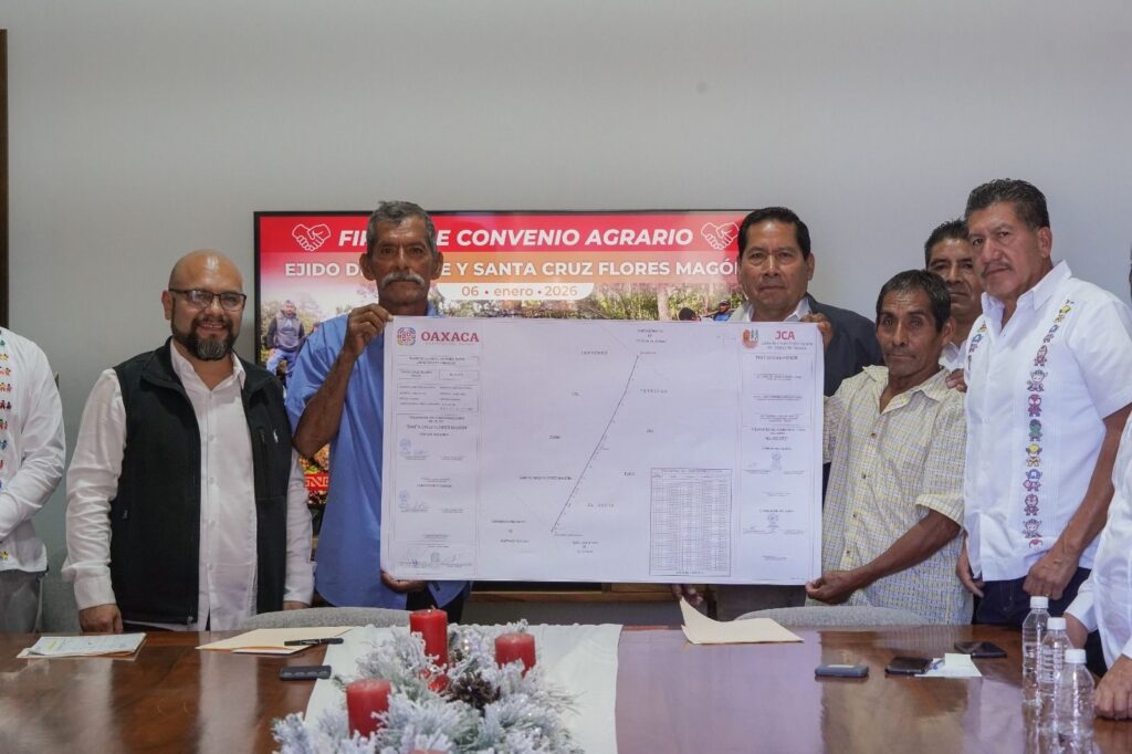 Oaxaca de Juárez, Oax. 7 de enero de 2026.- Como resultado del diálogo, la conciliación y la construcción de acuerdos; la Secretaría de Gobierno (Sego) y la Junta Local de Conciliación Agraria (JLCA) atestiguaron la firma de dos Acuerdos Definitivos de Paz Territorial, mediante los cuales autoridades de cuatro comunidades resolvieron conflictos históricos por límites agrarios, fortaleciendo la gobernabilidad y la paz territorial en sus regiones.