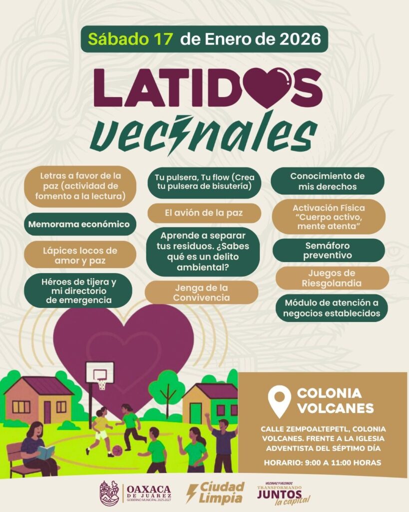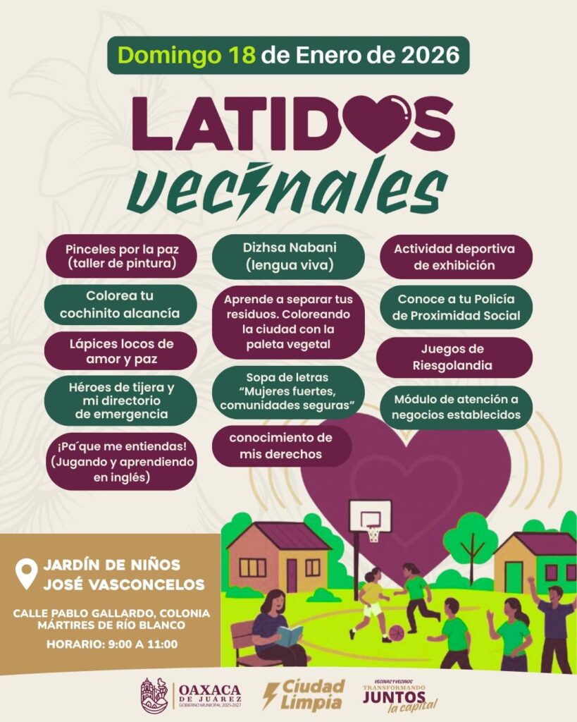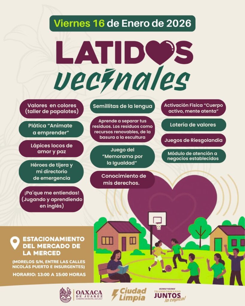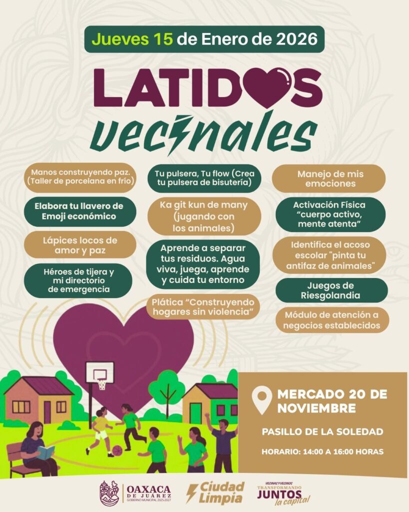 Oaxaca de Juárez, Oax. 15 de enero de 2026.- Con el objetivo de fortalecer la convivencia, fomentar entornos ordenados y seguir construyendo una ciudad limpia y segura, el Gobierno Municipal de Oaxaca de Juárez invita a vecinas y vecinos a participar en Latidos Vecinales, una estrategia de proximidad que llevará actividades recreativas, educativas y formativas a distintos puntos de la capital del jueves 15 al domingo 18 de enero.