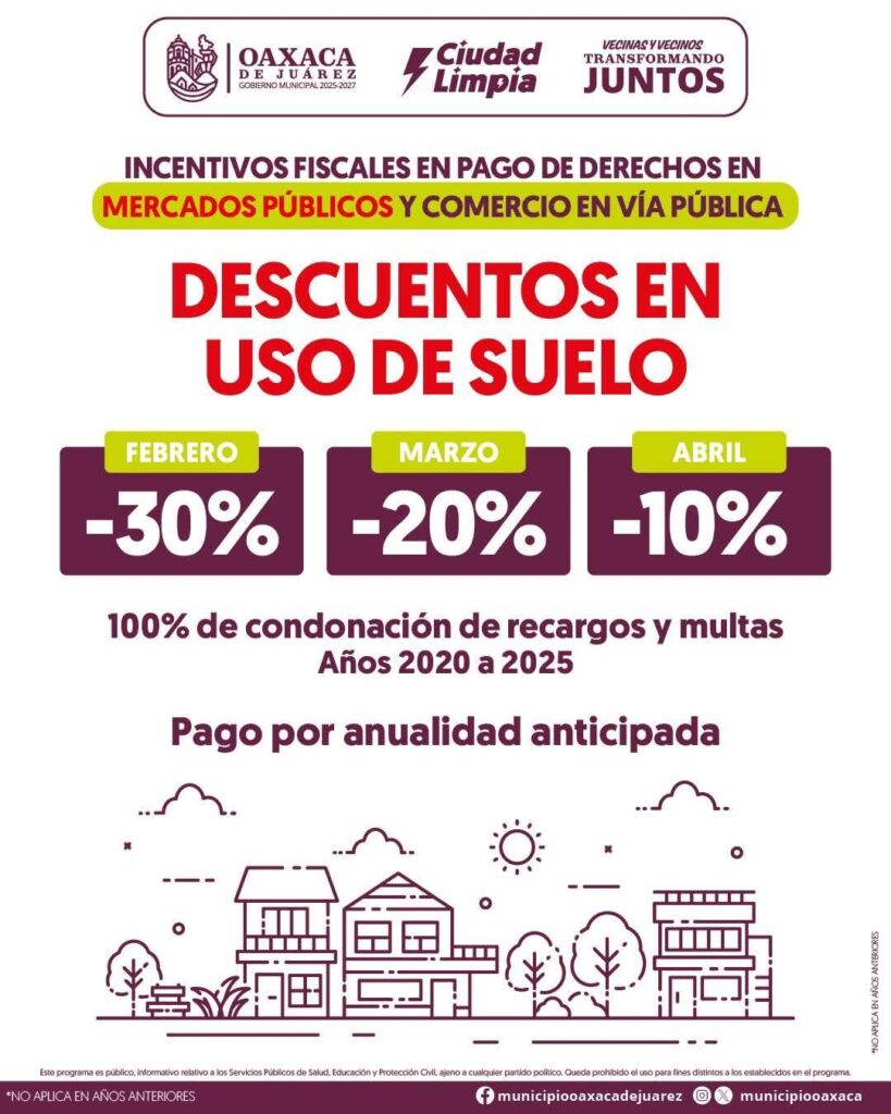 Oaxaca de Juárez, Oax., 30 de enero de 2026.– El Cabildo de Oaxaca de Juárez hace un llamado a las y los comerciantes de mercados públicos y del comercio en vía pública para que aprovechen el Programa de Incentivos Fiscales, el cual contempla descuentos vigentes durante los meses de febrero y marzo, así como la condonación del cien por ciento de recargos y multas correspondientes a ejercicios fiscales anteriores, con el propósito de facilitar la regularización, incentivar el cumplimiento de obligaciones y fortalecer la hacienda pública municipal .