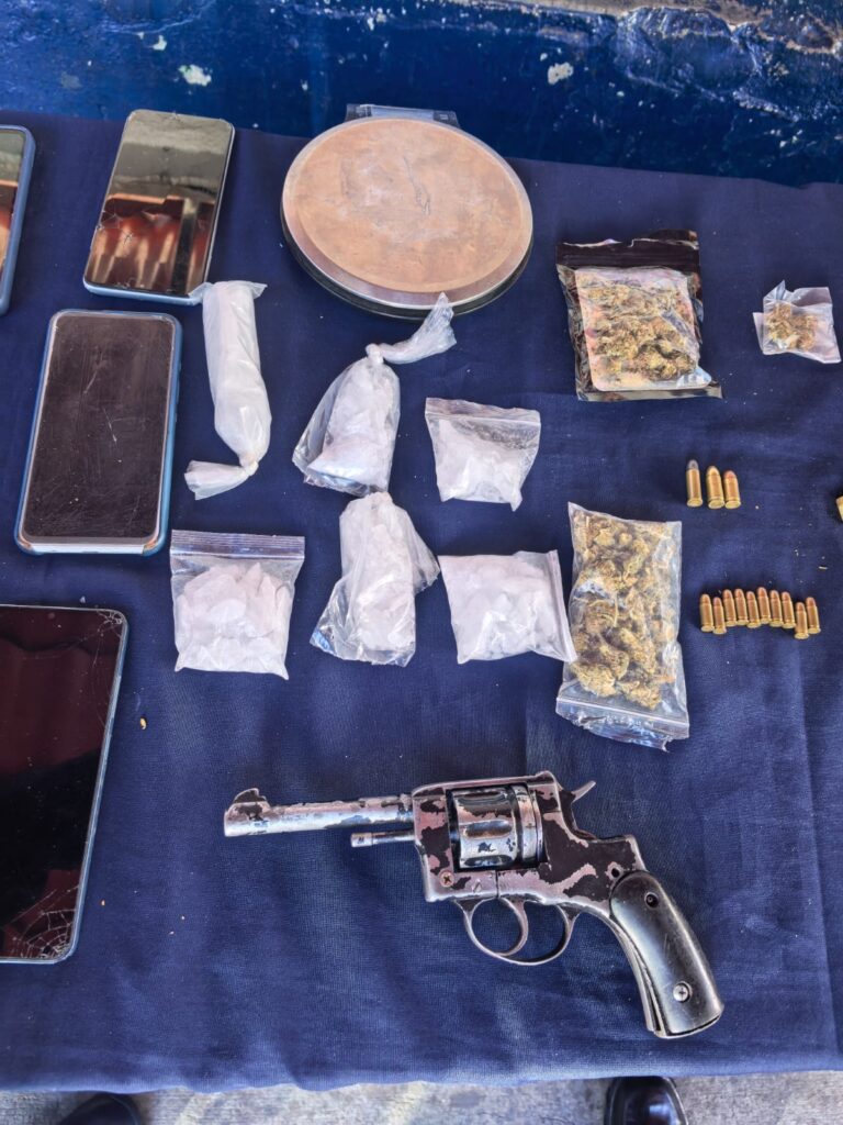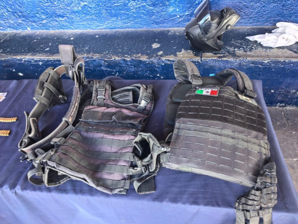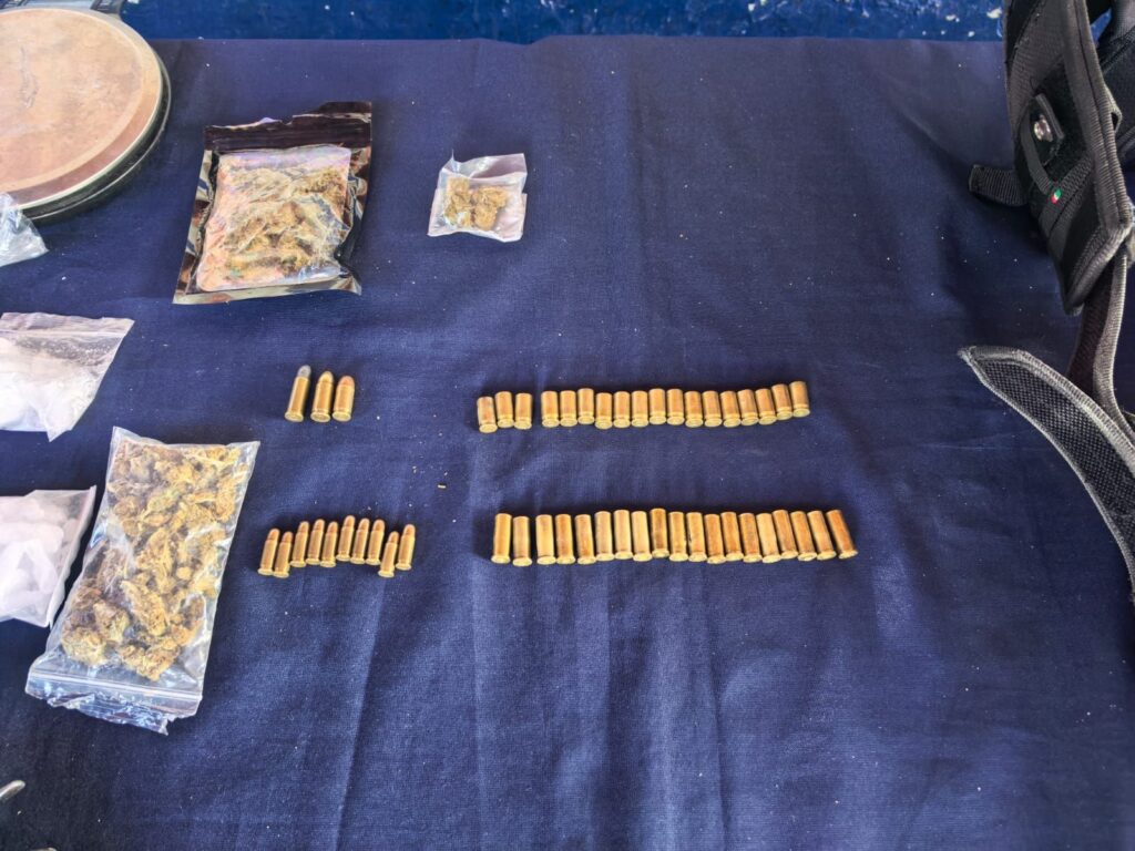 En la habitación, aseguran una pistola tipo revolver, varios teléfonos celulares, dosis de marihuana, cristal, una báscula gramera, varios cartuchos útiles y dos chalecos balísticos.