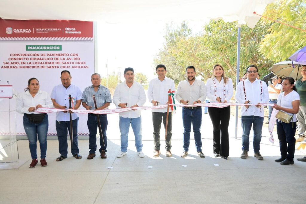 Santa Cruz Amilpas, Oax. 13 de febrero de 2026.- En atención a una añeja demanda ciudadana y como muestra de que la Primavera Oaxaqueña florece con obras en los municipios, el Gobernador Salomón Jara Cruz inauguró la primera etapa de la pavimentación con concreto hidráulico de la avenida Río Salado de Santa Cruz Amilpas, la cual tuvo una inversión de 4.4 millones de pesos.