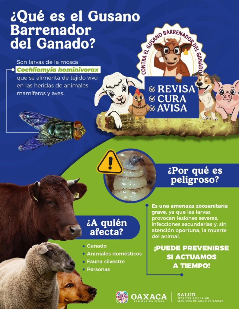 Oaxaca de Juárez, Oax. 5 de marzo de 2026.- Servicios de Salud de Oaxaca (SSO) informa que a la semana epidemiológica número 8, se han registrado seis casos positivos de miasis por Cochliomyia hominivorax (gusano barrenador) en personas, las cuales fueron atendidas de manera oportuna y dadas de alta sin complicaciones.
