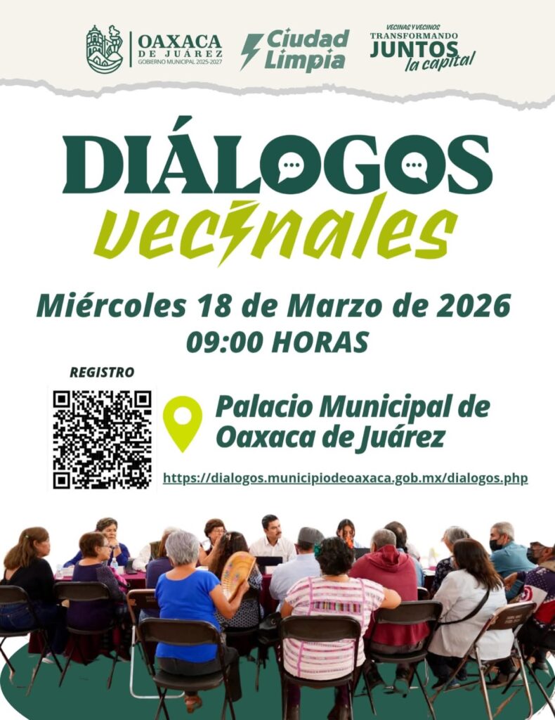 Oaxaca de Juárez, Oax., 17 de marzo de 2026.– Con el objetivo de fortalecer la participación ciudadana y construir soluciones conjuntas para la ciudad, el Gobierno Municipal de Oaxaca de Juárez que preside Ray Chagoya invita a la ciudadanía a participar en los Diálogos Vecinales, un espacio de encuentro para compartir ideas, escuchar propuestas y trabajar de manera coordinada por el bienestar de la capital.